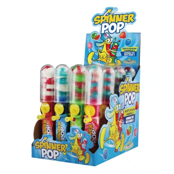 Funny Candy Spinner Pop γλειφιτζούρι που τίθεται σε κίνηση με λαβή μανιβέλας! Γυρίζοντας την μανιβέλα το γλειφιτζούρι περιστρέφεται. 23gr. 16τεμ.