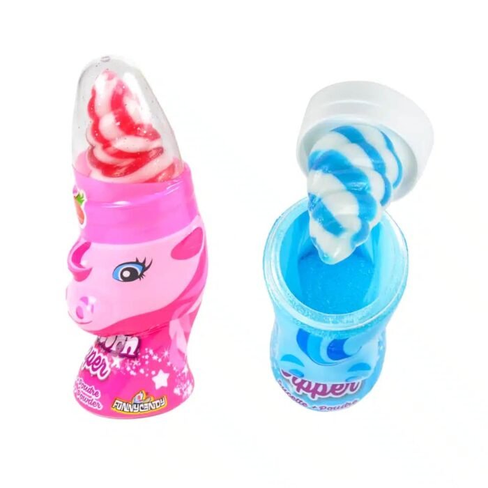 Funny Candy Unicorn Dipper 50gr. 12τεμ. Δίχρωμο στριφτό γλειφιτζούρι με καραμελόσκονη σκόνη. Το δοχείο έχει σχήμα κεφαλιού μονόκερου και το γλειφιτζούρι αντιπροσωπεύει το περίφημο μαγικό κέρατο αυτού του μυθικού ζώου που αγαπούν όλα τα παιδιά.