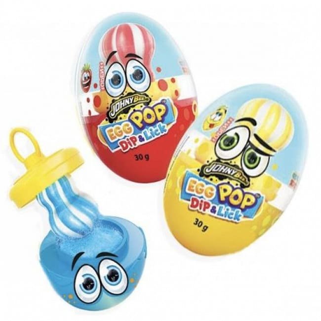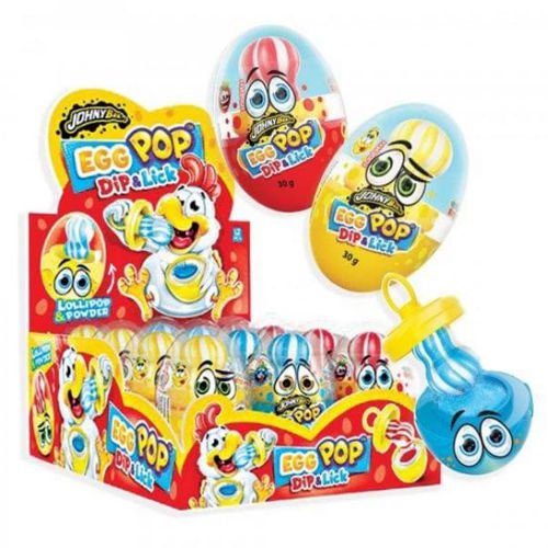 Johny Bee Egg Pop 30gr. 12τεμ.Γλυφιτζούρι σε σχήμα αυγό και καραμελόσκονη. Γέυση: φράουλα,λεμόνι,βατόμουρο.
